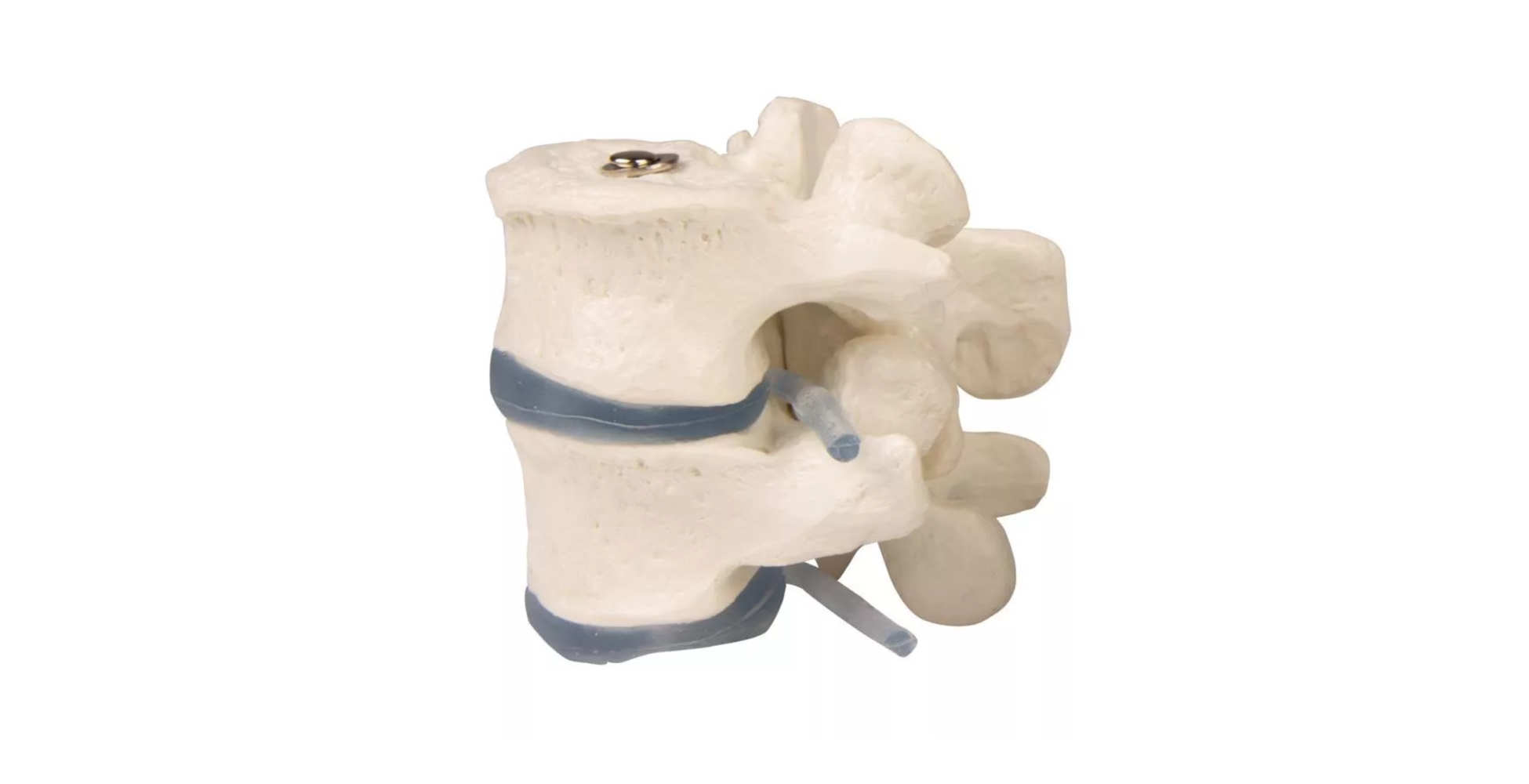 Este modelo incluye dos vértebras lumbares con sus respectivos discos intervertebrales, lo que permite estudiar la relación entre estas estructuras clave en la columna vertebral. Gracias a su diseño, es posible observar con claridad componentes anatómicos como el cuerpo vertebral, las apófisis y las superficies articulares.