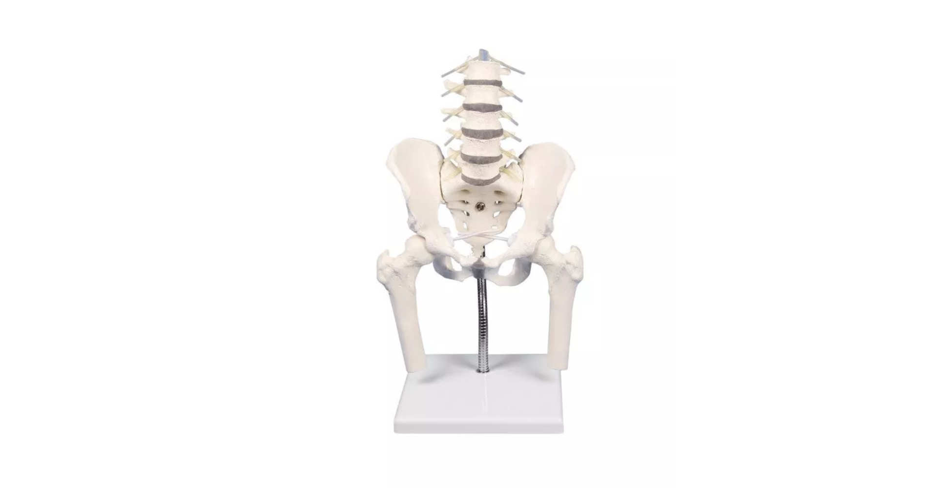 El modelo incluye las cinco vértebras lumbares (L1 a L5) junto con el sacro, además de una pelvis completa y muñones femorales extraíbles. Esta configuración permite estudiar de manera integral la relación entre la columna lumbar, la pelvis y la articulación de la cadera.