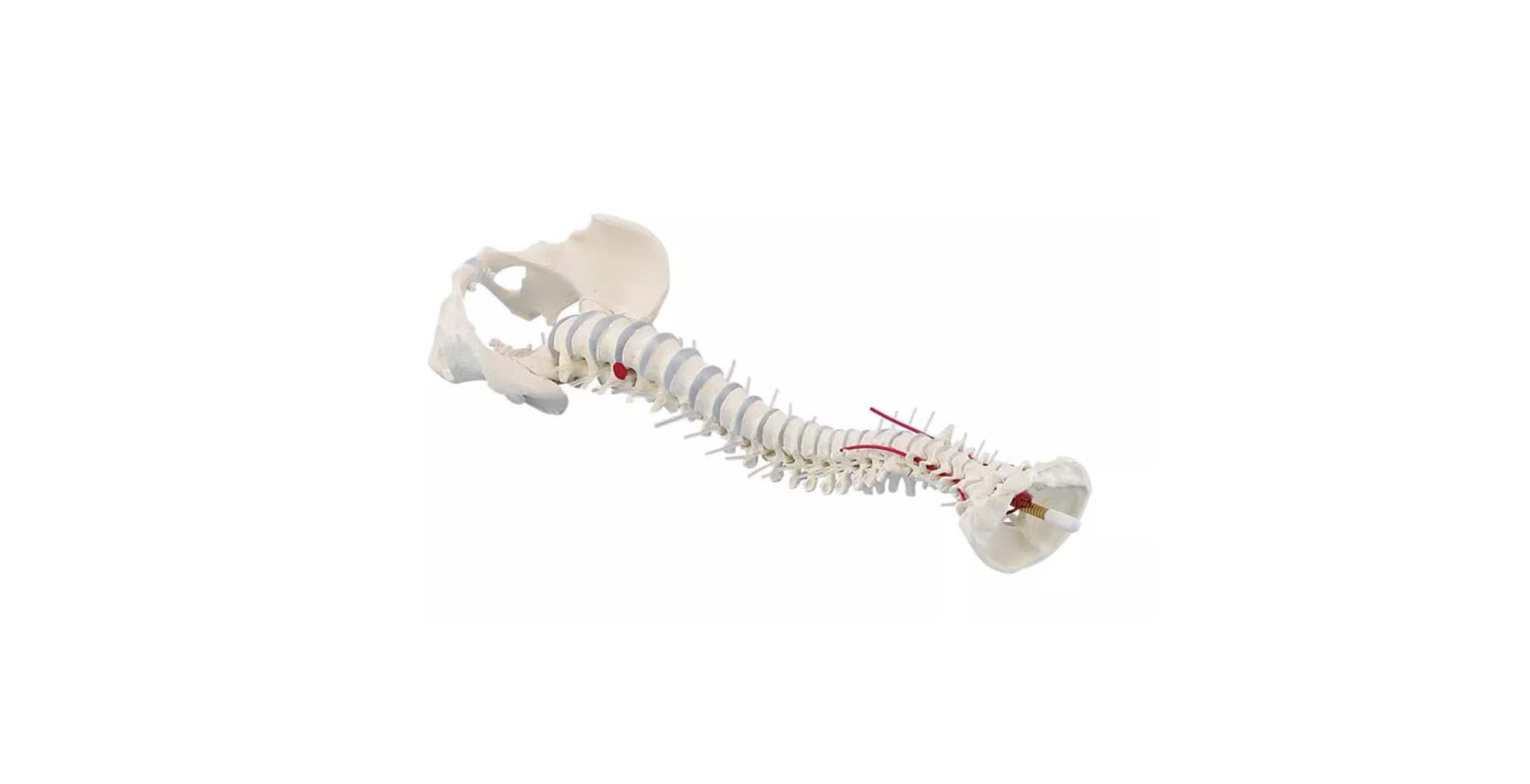 Este modelo es una réplica real de la columna vertebral humana, que incluye vértebras cervicales, torácicas y lumbares, así como el sacro, cóccix y una pelvis extraíble. Esta configuración permite estudiar la relación estructural entre la columna y la pelvis, fundamental para comprender la postura y la distribución de cargas.