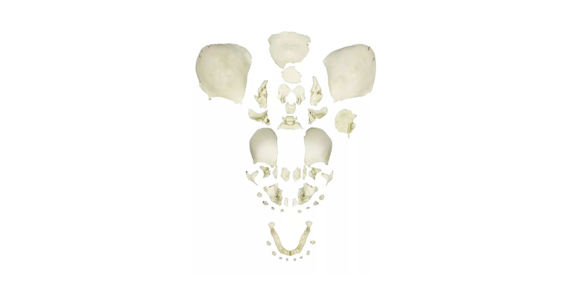El modelo corresponde a un cráneo fetal a término desarticulado, lo que significa que cada uno de los huesos se presenta de forma independiente. Esto permite estudiar con claridad la morfología, tamaño y características de cada componente óseo en esta etapa del desarrollo.