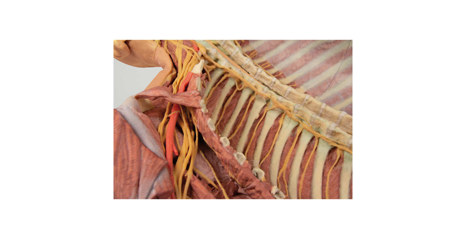 La eliminación de la pared torácica anterior, las clavículas y las primeras costillas permite una exposición clara y bilateral de las axilas. En esta región, el modelo muestra con gran precisión el plexo braquial, las arterias axilares y la musculatura circundante, facilitando el aprendizaje de las relaciones neurovasculares y los abordajes quirúrgicos del hombro.