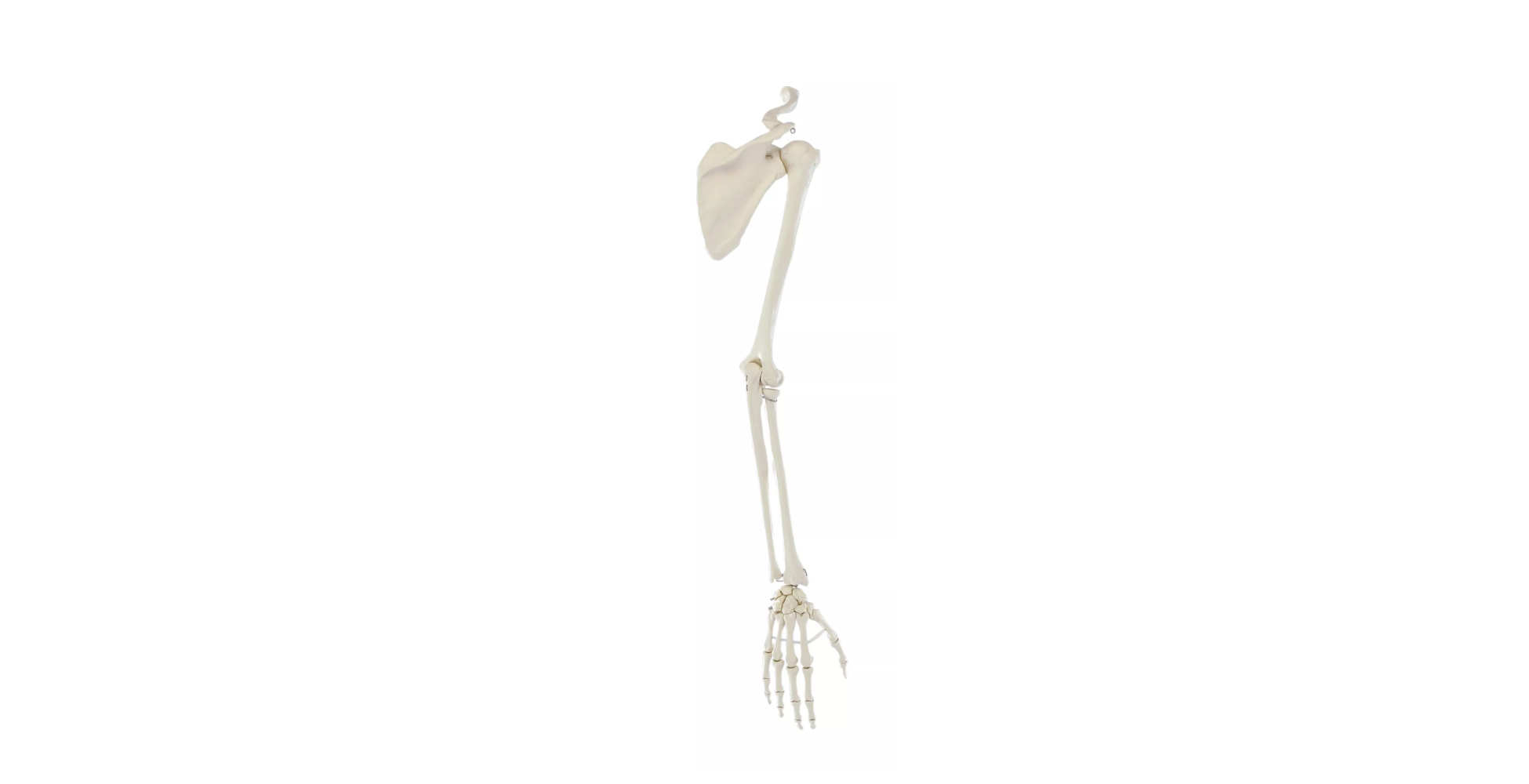 Este modelo anatómico del brazo permite comprender la relación entre las diferentes estructuras óseas del miembro superior, incluyendo la escápula, clavícula, húmero, radio, cúbito y huesos de la mano.