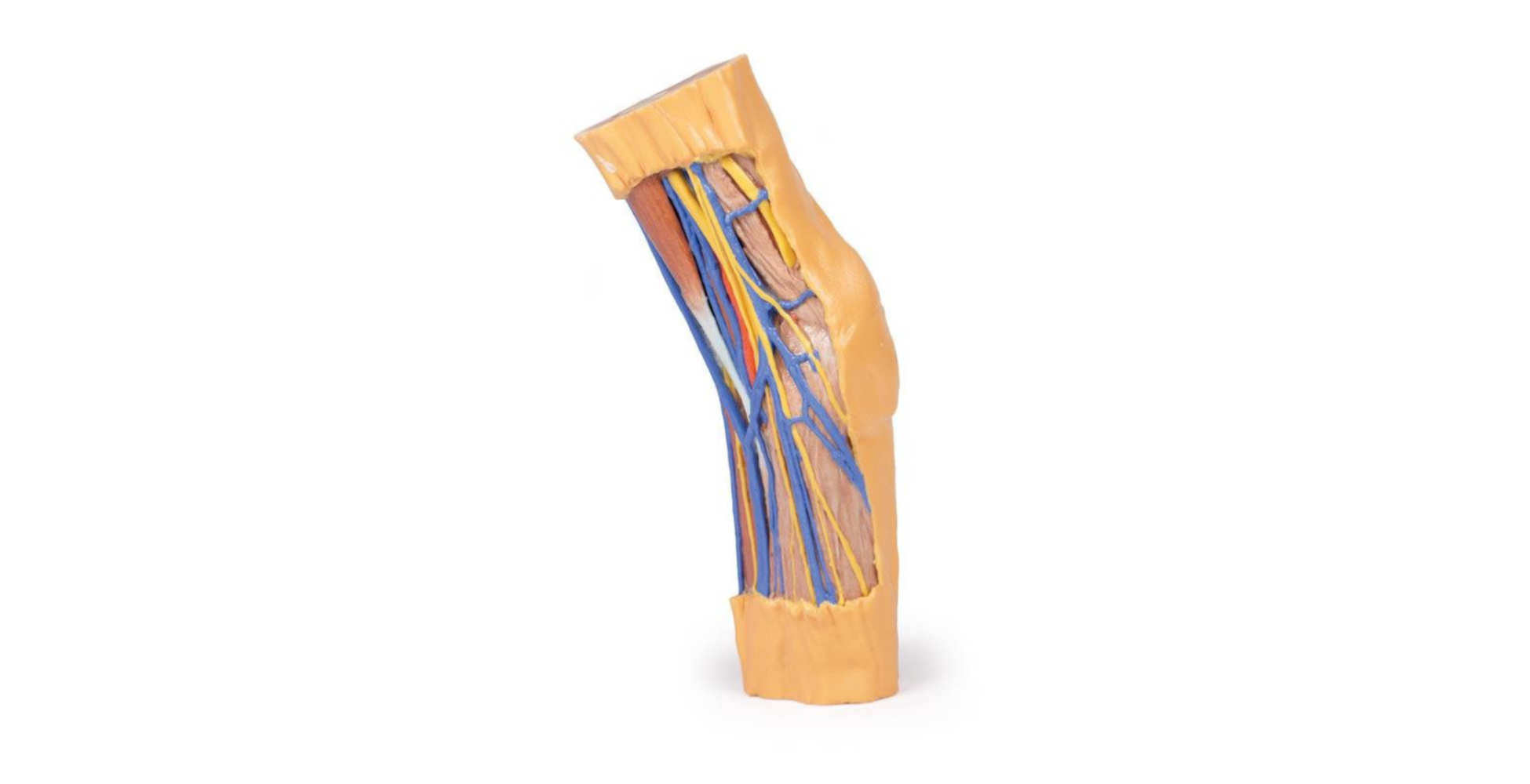 El modelo conserva de forma precisa las principales venas superficiales del miembro superior, incluyendo la vena cefálica, vena basílica y vena cubital media, fundamentales para la práctica de venopunción y acceso vascular. Estas estructuras se acompañan de los nervios cutáneos medial, lateral y antebraquial posterior, lo que facilita la comprensión de la inervación superficial y su relación con los trayectos venosos.