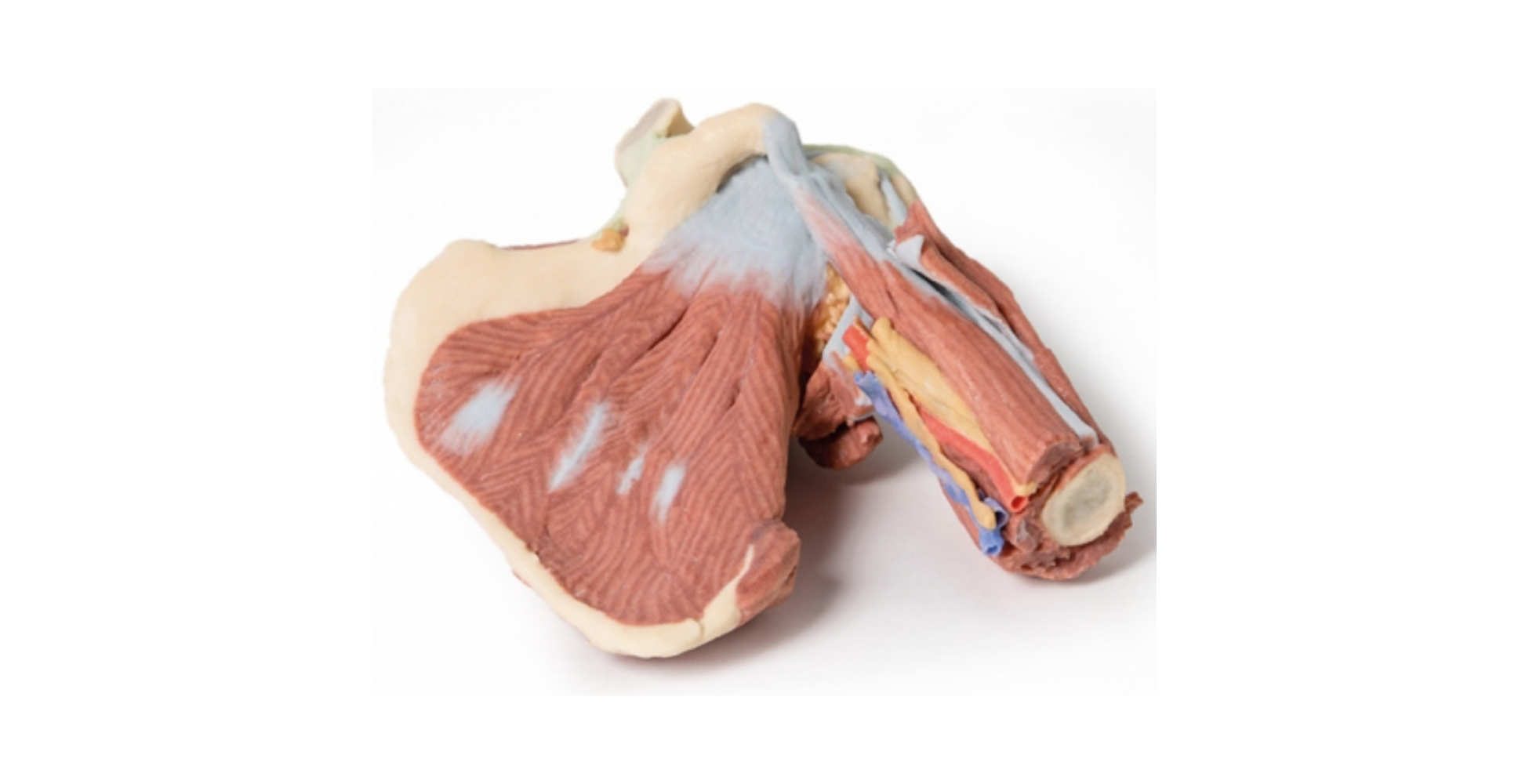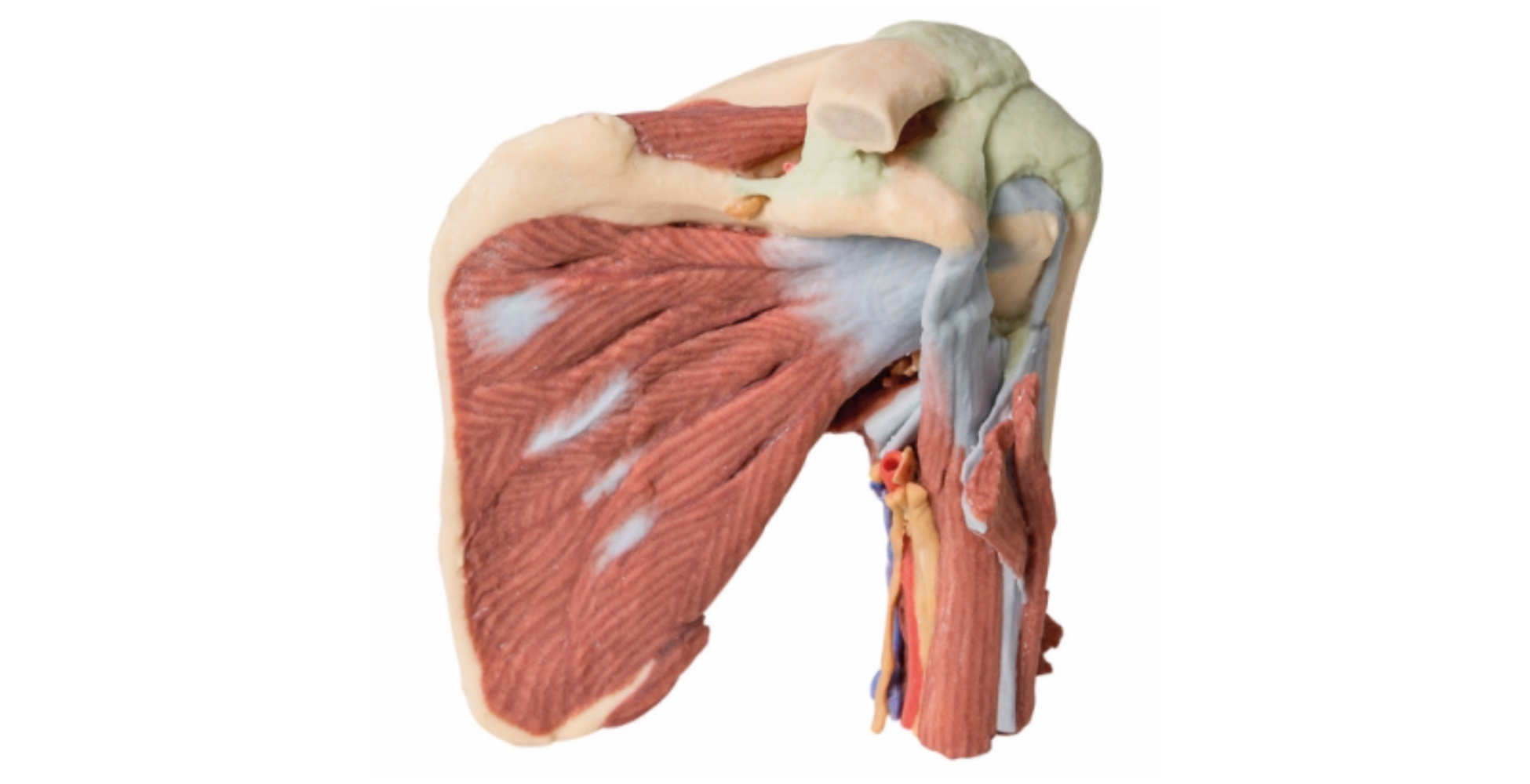 Este modelo anatómico impreso en 3D del hombro izquierdo ofrece una disección profunda y altamente detallada de la articulación del hombro, integrando la escápula, el húmero proximal (hasta la diáfisis media) y las principales estructuras musculares, nerviosas y vasculares asociadas. Su diseño proporciona una visión completa de la articulación glenohumeral, convirtiéndolo en una herramienta ideal para la enseñanza médica, la formación clínica y la referencia anatómica avanzada.