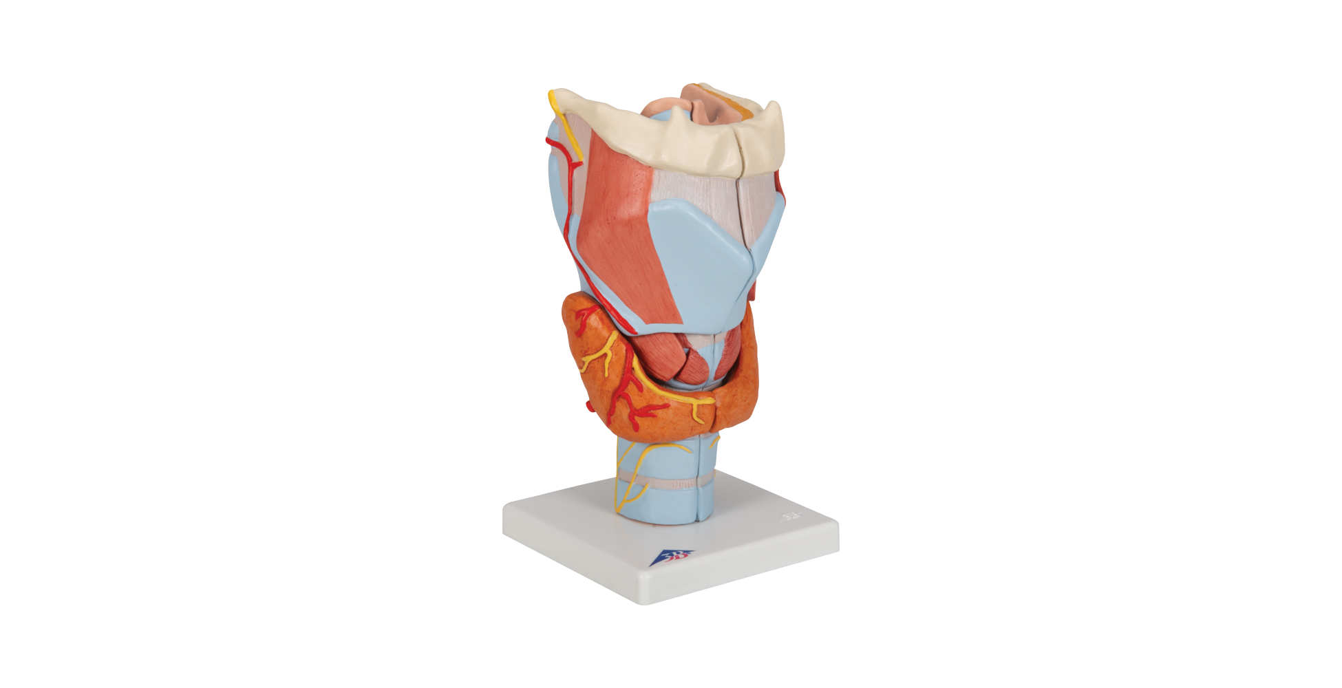 Este modelo anatómico de tamaño natural presenta un corte medio detallado de la región del cuello, permitiendo observar con precisión la estructura y relaciones anatómicas de la laringe, tráquea, glándula tiroides, ligamentos, músculos, vasos sanguíneos y nervios cervicales. Es ideal para la enseñanza de anatomía humana en instituciones médicas y centros de formación profesional.