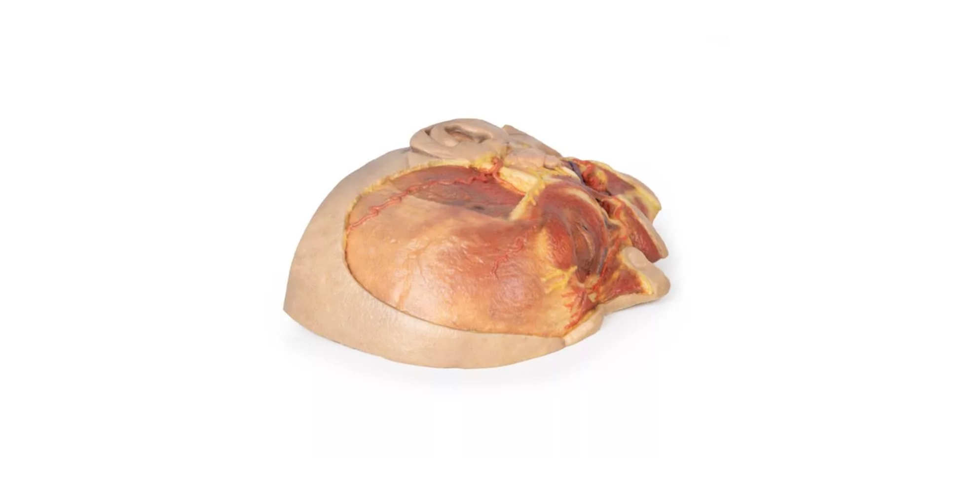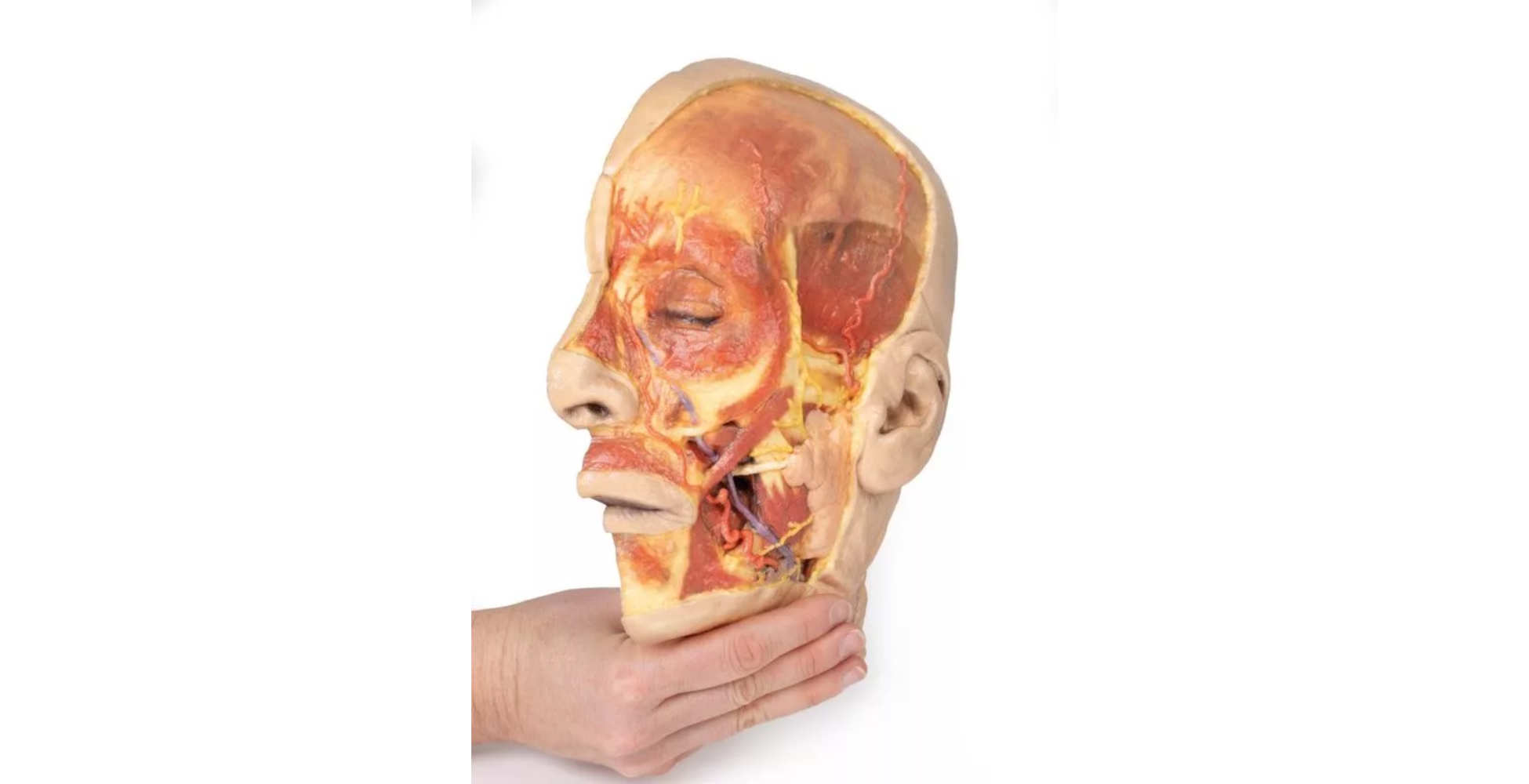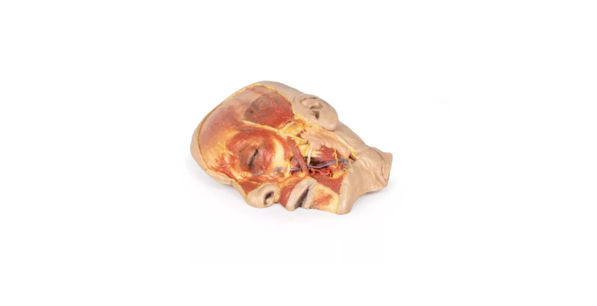 El modelo anatómico impreso en 3D “Superficial Face” presenta una disección superficial detallada del lado izquierdo del rostro, realizada justo por delante de la región auricular. Las estructuras neurovasculares y musculares se encuentran resaltadas en falso color, lo que facilita su identificación y comprensión en entornos académicos y clínicos.