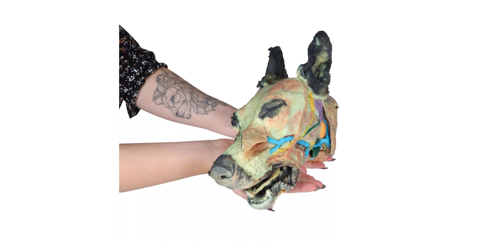 Modelo anatómico cabeza de perro con disecciones superficiales y profundas para estudio veterinario
