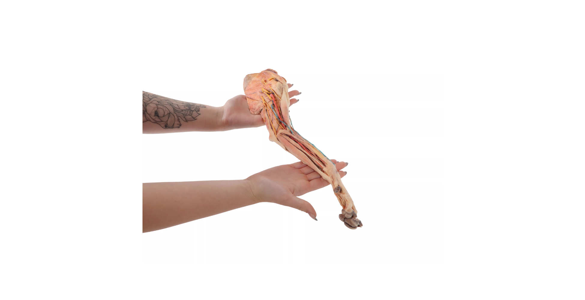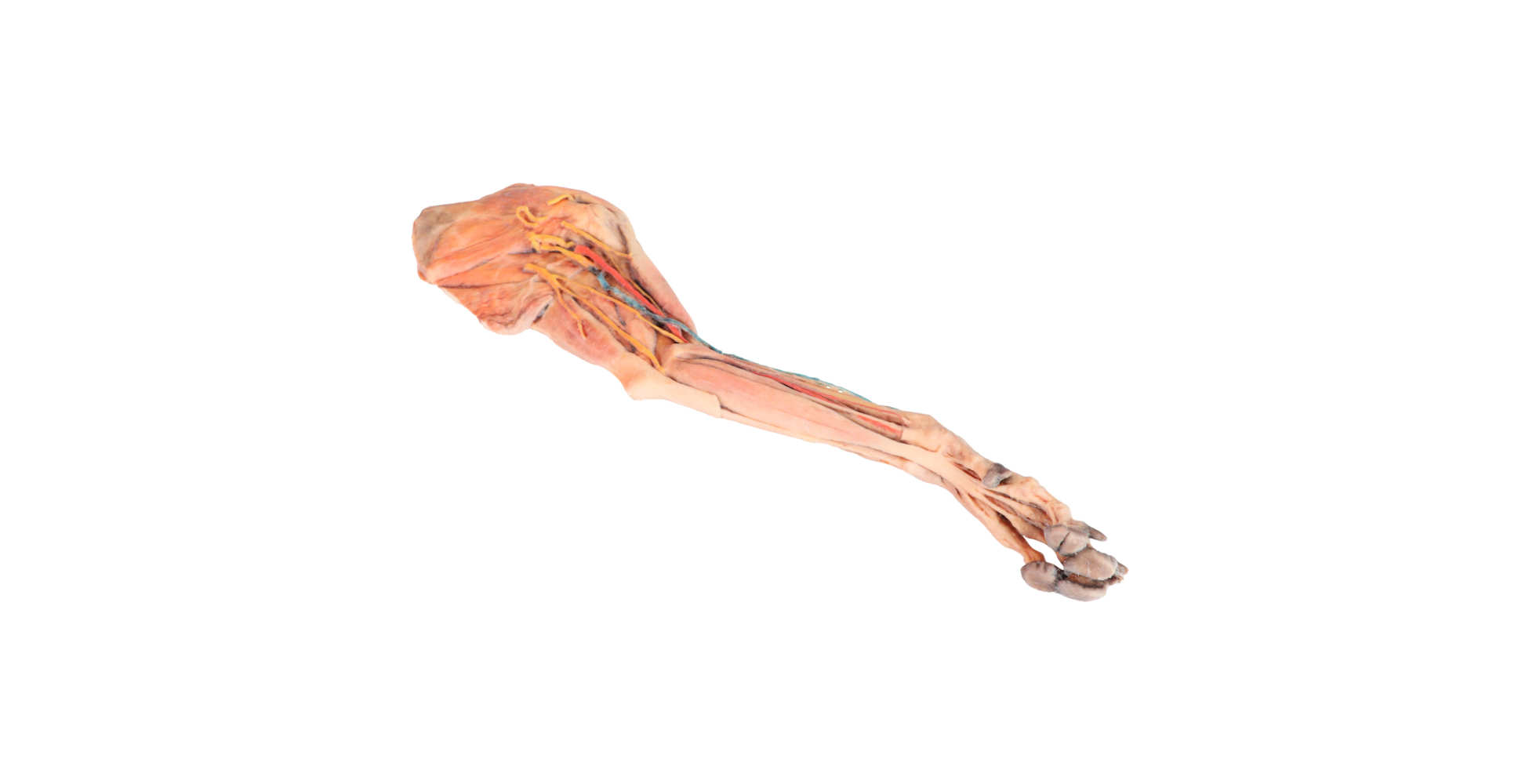 El modelo presenta la anatomía superficial de la extremidad anterior derecha del perro, conservando estructuras clave desde la región escapular hasta la mano. Esta representación permite estudiar la disposición y relación entre músculos, tendones, ligamentos, nervios y vasos sanguíneos.