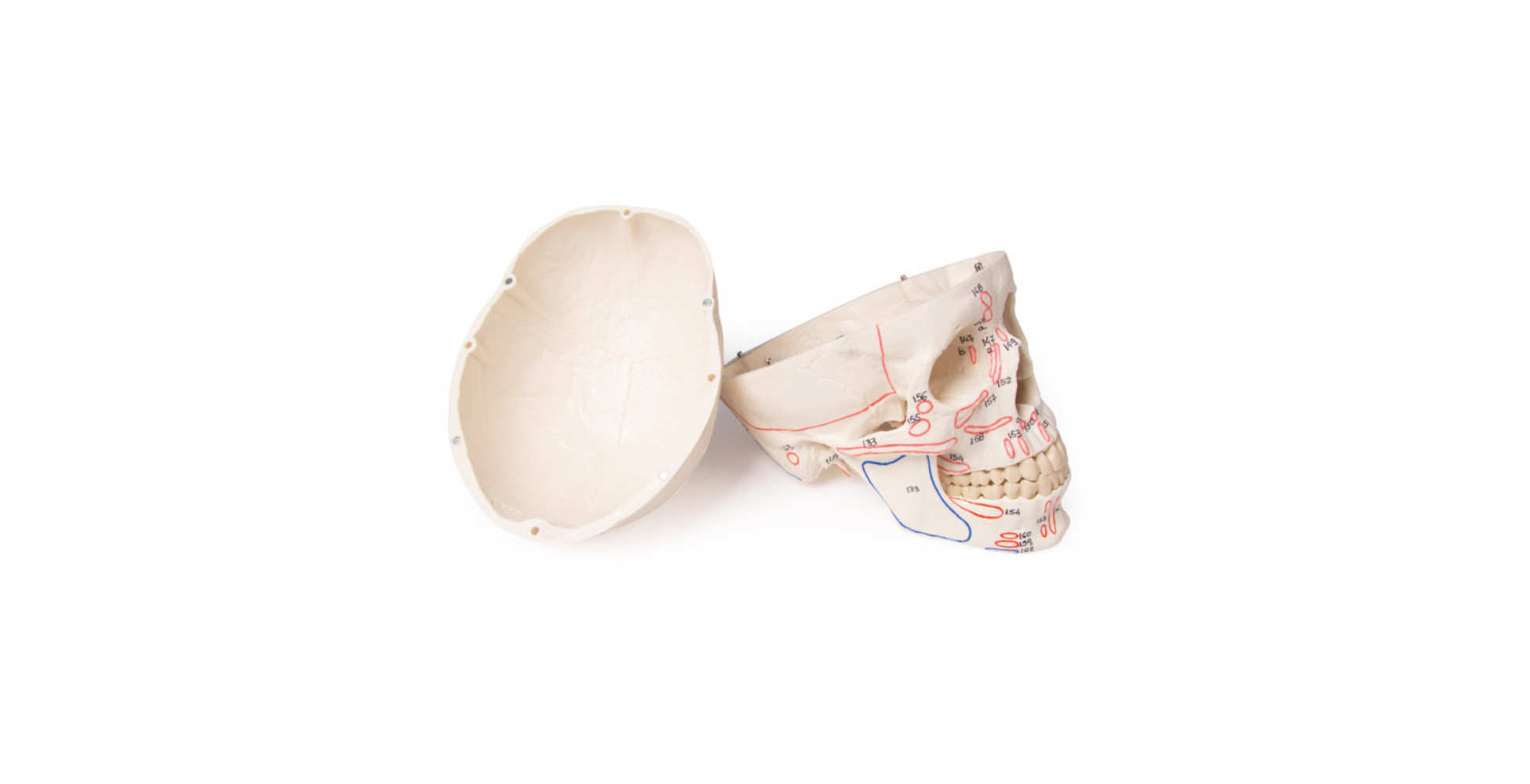 Este modelo permite no solo estudiar los huesos del cráneo, sino también entender cómo los músculos interactúan con estas estructuras, facilitando un aprendizaje más completo.