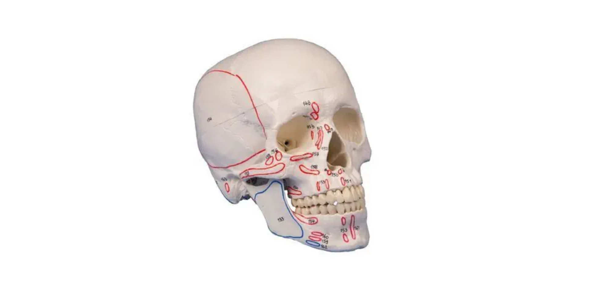 Una de las principales ventajas de este modelo es la inclusión de marcajes musculares, que indican claramente los puntos de origen e inserción de los músculos. Esta característica permite comprender la relación entre el sistema óseo y el sistema muscular, especialmente en áreas como la masticación, la expresión facial y la movilidad mandibular.