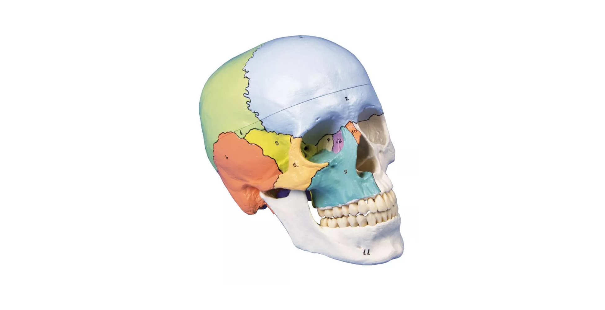 Una de las principales características de este modelo es su pintura didáctica en uno de los lados del cráneo, donde cada hueso está representado con un color diferente. Esto permite identificar de forma rápida y clara las distintas estructuras óseas.