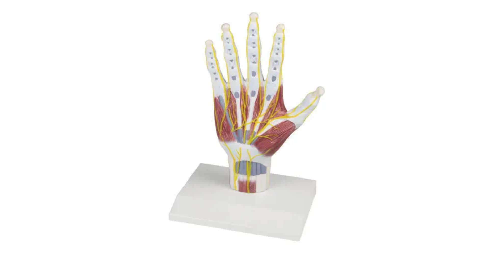 Este modelo anatómico de mano completa permite comprender la interacción entre los diferentes sistemas que componen la mano. A diferencia de modelos exclusivamente óseos, este recurso integra componentes musculares, tendinosos y nerviosos, facilitando una comprensión más profunda de la funcionalidad y biomecánica.