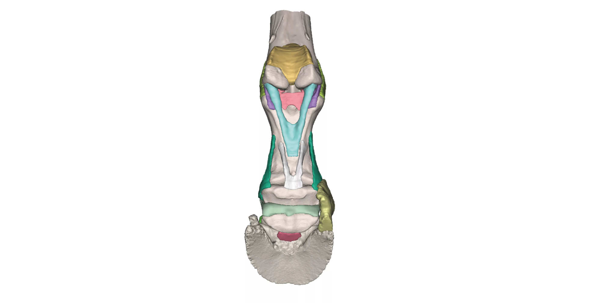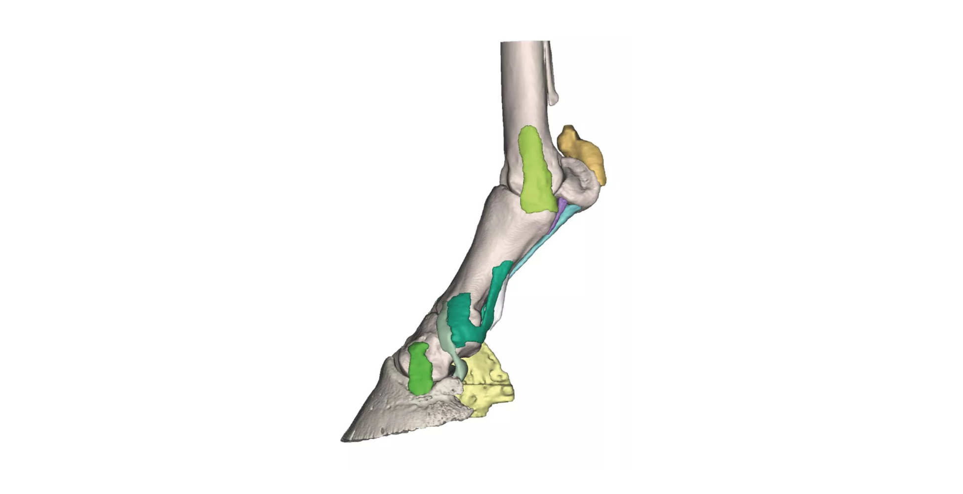 El modelo destaca por mostrar con precisión los ligamentos profundos de soporte, estructuras esenciales que contribuyen a la estabilidad del pie del caballo en ausencia de elementos dinámicos como tendones. Esta visualización permite comprender cómo se mantiene la integridad estructural del pie en condiciones estáticas y de carga.